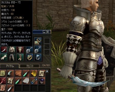 ▼今日の『リネージュ2』 クリスタルダガー制作完了!Cグレード最強のダガーであるクリスタルダガーを制作しました。 ![]() 「念願のクリスタルソードを手に入れたぞ!」 すっげ疲れた!金も掛かった!時間も掛かった!もうガラハドぐらい頑張ったよ! 所持金なんて二人で100k切ったよ!ダメダメだよ! 制作費は手持ちの材料を抜かせば3Mほど。 クリスタルダガーの相場が9Mなので、かなりウマウマです。 その代わり朝も深夜も関係なしにCPU稼働率100%でガリガリ稼働して露店を開く必要がありますがね! 熱暴走でサイドケース全開+扇風機(風力:中)という最悪の環境!お陰で寝不足!目の隈ビッチリ! てーことで、装備。 ![]() まだレベルが40前であるアサシンは装備出来ないので、代理にダークアベンジャーに装備させました。 うおう、正直そんなカッコよくねー!クリスタルダガーの次に強いダークスクリーマーのが格好いいけど、そんなの気にしないさ!Cじゃ最強なのさ! 付与できる機能も微妙だけど全然気にしないね!C3になってマイトモータルがクリティカルダメージになったのが気に入らないけど、知っててやったからいいのさ! さーて、今度はアサシン用のCの防具制作だー。……いやもう疲れました枯れましたくたびれました。 マジか!!超行きたいよ! 『御存知TerraLuna』ってテラルナって有名か?メチャファンだけど。 アイコンが少し見づらいけどなかなかいい感じに。 時間がなくて食べることしか楽しみがない人もいるでしょうしね。 小麦粉を水に溶かしたものはそんなに不味くない。 かつての栄花はどこに行ったか、今は各局のお荷物番組ですね。 昼食後には歯磨きしないなー。 ウチの近所あるダイエーはまだ潰れていませんね。まぁバイトを750円で雇うようだから経営は芳しくないだろうけど。 現役だったころは生まれていなかったので、ご活躍の方がリアルでは知りませんが、お悔やみを申し上げます。 ニュースを見る限りでは捏造という可能性も濃厚ですね。日本への長期滞在を目的としたものかな。