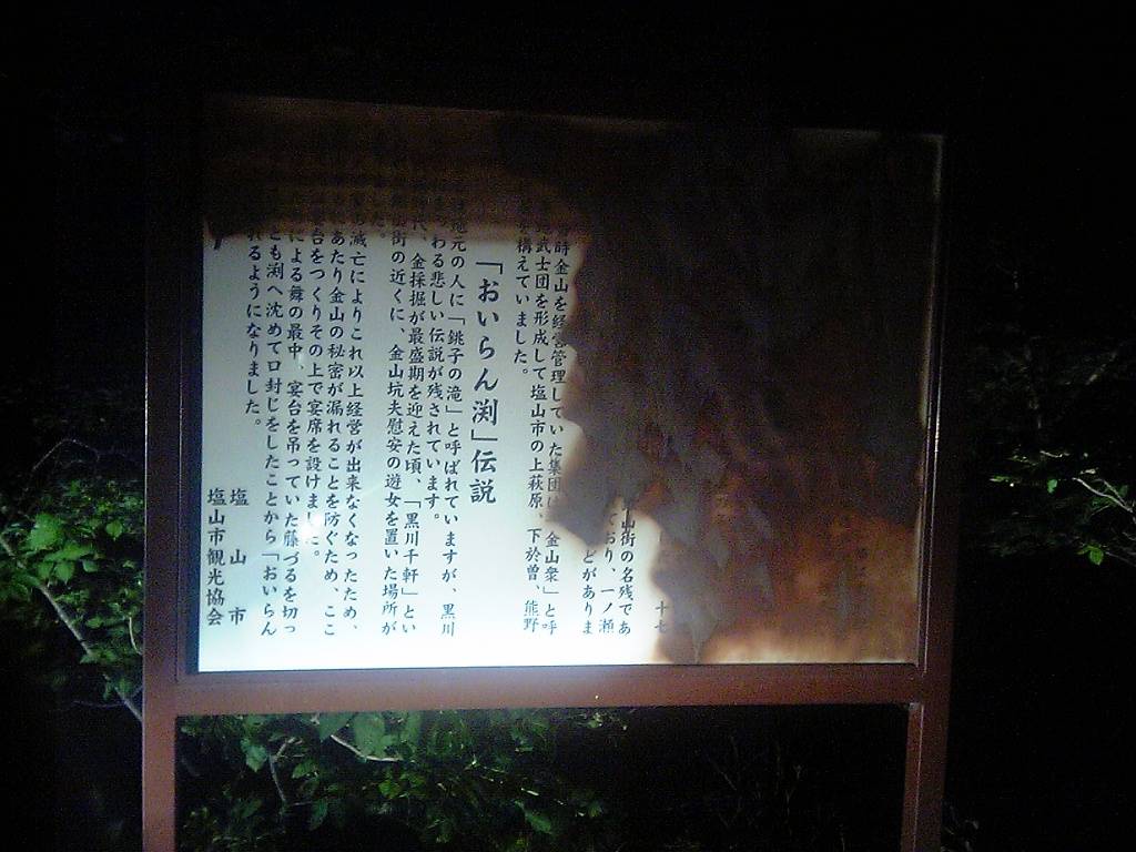 前回8月20日に行ったときは崖崩れにより通行止めだったので、花魁淵にはたどり着けませんでした。 9月の上旬に崖崩れの規制が解除されたので、9月10日、2回の挑戦です。 花魁淵までの行き方は、山梨県塩山市を走る国道411号線を東京都の奥多摩方面に登り、 外灯も一本もないような曲がりくねった峠道を10数kmほど車で走らせると、道の脇に花魁淵はあります。 一ノ瀬と丹波山村の境目辺りですね。道沿いに慰霊塔があるので注意して運転すれば車からでもすぐ見つかると思います。 今回は前回とは違い、それなりに下調べをしたため、何事もなく到着しました。 道路のすぐ下に渓流の流れる音が耳に届きます。この渓流に遊女たちが落とされたのでしょう。多分。 ![]() これが、花魁淵に建てられている慰霊塔。 花魁淵に行ったことがあるサイトではよくこの写真が掲載されています。この慰霊塔を見て兼ねてからの悲願であった花魁淵に辿り着いたんだなぁと感慨。 慰霊塔に付着している赤いものは、どこぞのアホがいたずらにスプレーで塗りたくったものだと思います。誰だか知らないけどそんなことをする奴は死ねばいいのにね! ![]() 慰霊塔の根本の写真。 供養のためか、小銭が大量に置かれていました。私は一円も置きませんでした。 花魁淵の伝説が書かれている看板。右側がごっつ錆びています。 ほかのサイトの写真では錆びている様子は全くなかったので、ここ数年で急激に錆びたのかな。 ちなみにこの看板を写真に撮ると、帰りに事故に遭うといういわくがあります。特に遭いませんでした。 ![]() 慰霊塔の脇に渓流を見るための道があったので、降りてみました。 写真に映っている白いものは沢に落ちないためのフェンス。……遊女たちが落とされたという渓流は暗くて何も見えませんでした。渓流の流れる音はよく聞こえるんですけどね。 ▼雑感 私はここ数日の睡眠不足がたたっていたため、怖いというより眠かったです。 それに山道といっても国道沿いにあるので、あまり怖いという感じではなかったですね。 つい最近まで長期に渡っての崖崩れ工事があったので花魁淵のすぐ先に工事中のランプがピカピカ光っていました。雰囲気台無し。かなりぐたぐた感が漂っていました。前回は花魁淵にすら辿り着いてもいないのに、一ノ瀬周辺の脇道だけでビビっていたのは何故なんでしょうか。 ▼追記 上記までのレポートは9月11日に書かれたものですが、今日12日に追記します。花魁淵で撮った写真は上のものだけではなく、そのほかにも幾つか撮ったんですが、 その写真を眺めていたら一枚だけ何かおかしなものが写っていました。低解像度だとわかりにくいので、未加工の高解像度版をリンクさせておきます。 写真はこのレポートの一枚目にある慰霊碑の左側から撮ったものです。 右上に青白い人の顔のようなものが写っているように見えます。 ちょっといかにも過ぎる心霊写真(?)なので嘘くさいですが、写真には何の細工もしていません。 この場所の状況説明をすると、時間は20時前後、天気は晴れ。写真の左側に当たる場所は木が鬱蒼と生い茂っており、 右側は国道に面していて何もない空間でした。道路があるだけで木などは一本も生えておらず、それらを見間違えということはないでしょう。その下の明かりは崖崩れ工事のランプですね。 そもそも外灯も一本もないような場所です。 私のぼろい携帯デジカメでは車のライトを当てても数m先しか撮れないぐらい暗いので、狙った被写体以外はそう簡単に撮れるはずはないと思います。 私は無宗教で無神論者で幽霊なんて全く信じていないんですが(なら心霊スポット巡りなんてするな)、 そんな私でも何だかイヤーンな感じです。この写真を見つけた時は一瞬キモが冷えました。 ……何事もなく終わったと思ったのにまさか最後にこんな落とし穴があるとは思いませんでした。 点が3つあれば顔に見えるという輪郭誘導現象であればいいなぁ。……物理的に写るものは何もないけどね! |